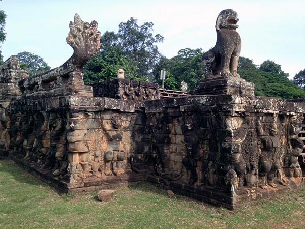 В свое время на ней проходили праздничные дворцовые церемонии. На ней король принимал военные парады, в которых участвовала могучая и непобедимая военная техника того времени – слоны. Одним словом это – королевская площадь, если так можно сказать, аналог нашей Красной площади. Терраса использовалась также как место ожидания перед аудиенцией в Королевском зале. Основное назначение этой террасы – наглядная демонстрация величия существующей власти. Поэтому она также украшена всевозможной каменной резьбой: тут и мистические человеко-птицы Гаруды из индийской мифологии и львы, размером с взрослого человека, сцены битв и войн. Когда-то это была неописуемая красота и богатство. В китайских хрониках ученые разыскали упоминания о визитах сюда послов. Так те рассказывали, что в зал приемов былукрашен золотом, возле колонн были зеркала, а трон короля укрывался за золотым занавесом.